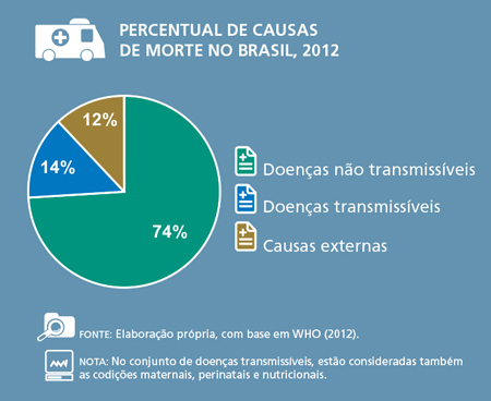As doenças transmissíveis representam 13,5% do total de mortes, sendo relevantes a Aids, a tuberculose, a doença de Chagas e as doenças diarreicas. Em relação às causas externas, chama a atenção o fato de o Brasil, apesar de ser um país de renda média-alta, ter um percentual de mortes acima da média dos países de renda baixa. Entre as causas externas, as mais significativas são a violência e os acidentes de trânsito.