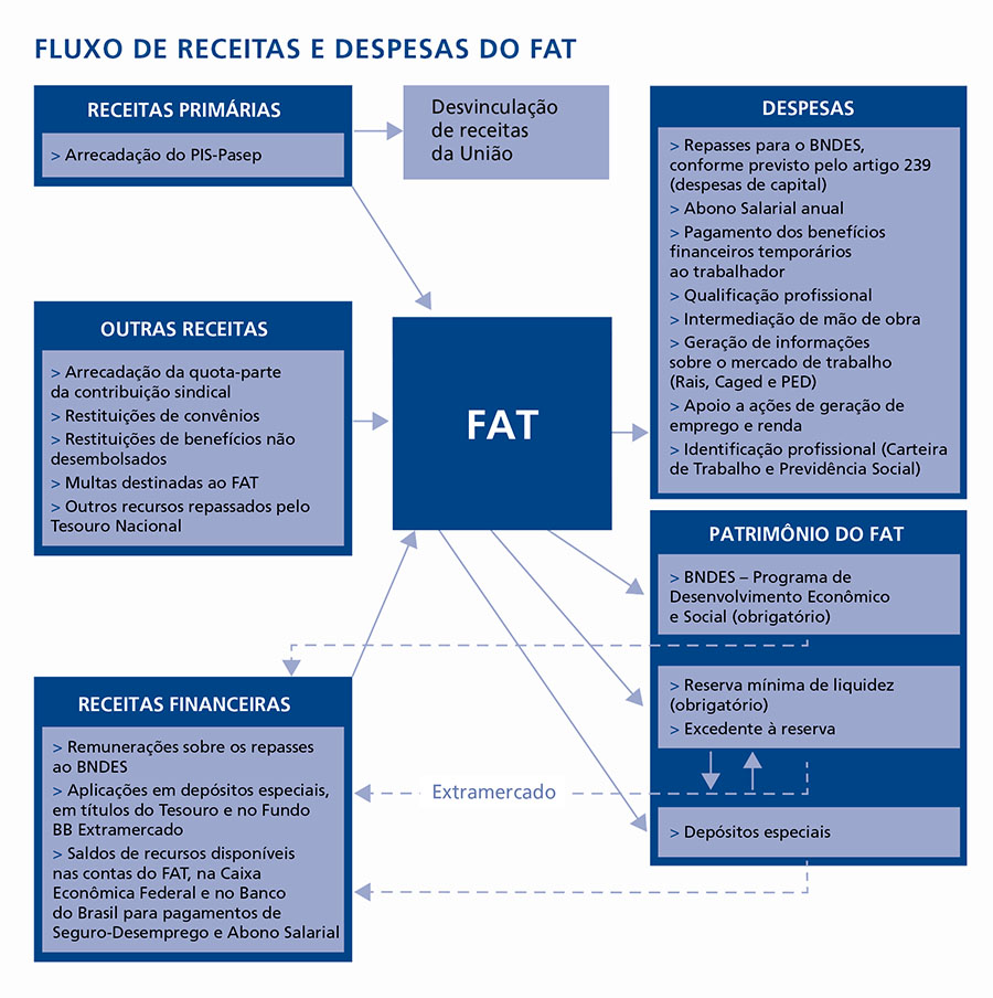 O FAT é um fundo especial vinculado ao Ministério do Trabalho. O artigo 239 da constituição de 1988 determinou que os recursos Programa de Integração Social (PIS)-Programa de Formação do Patrimônio do Servidor Público (Pasep) fossem direcionados a esse fundo especial que, além de custear o seguro-desemprego e o abono salarial, teria 40% de seus recursos destinados a ações de desenvolvimento econômico, por meio do BNDES.