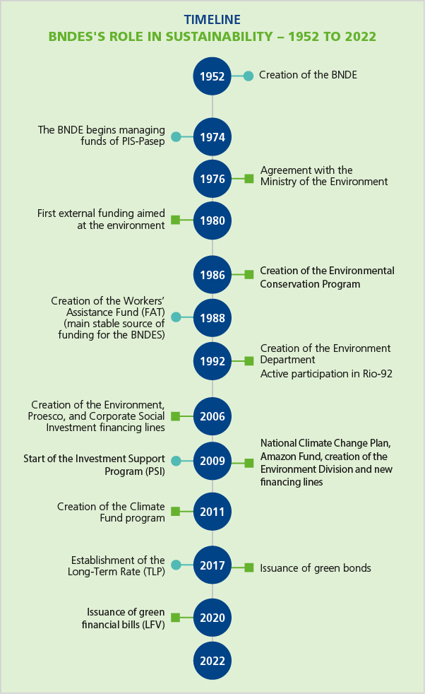 In the mid-1970s, the BNDES began the inclusion of the environmental agenda in its core activities with the establishment of an agreement with the Brazilian Secretariat for the Environment.