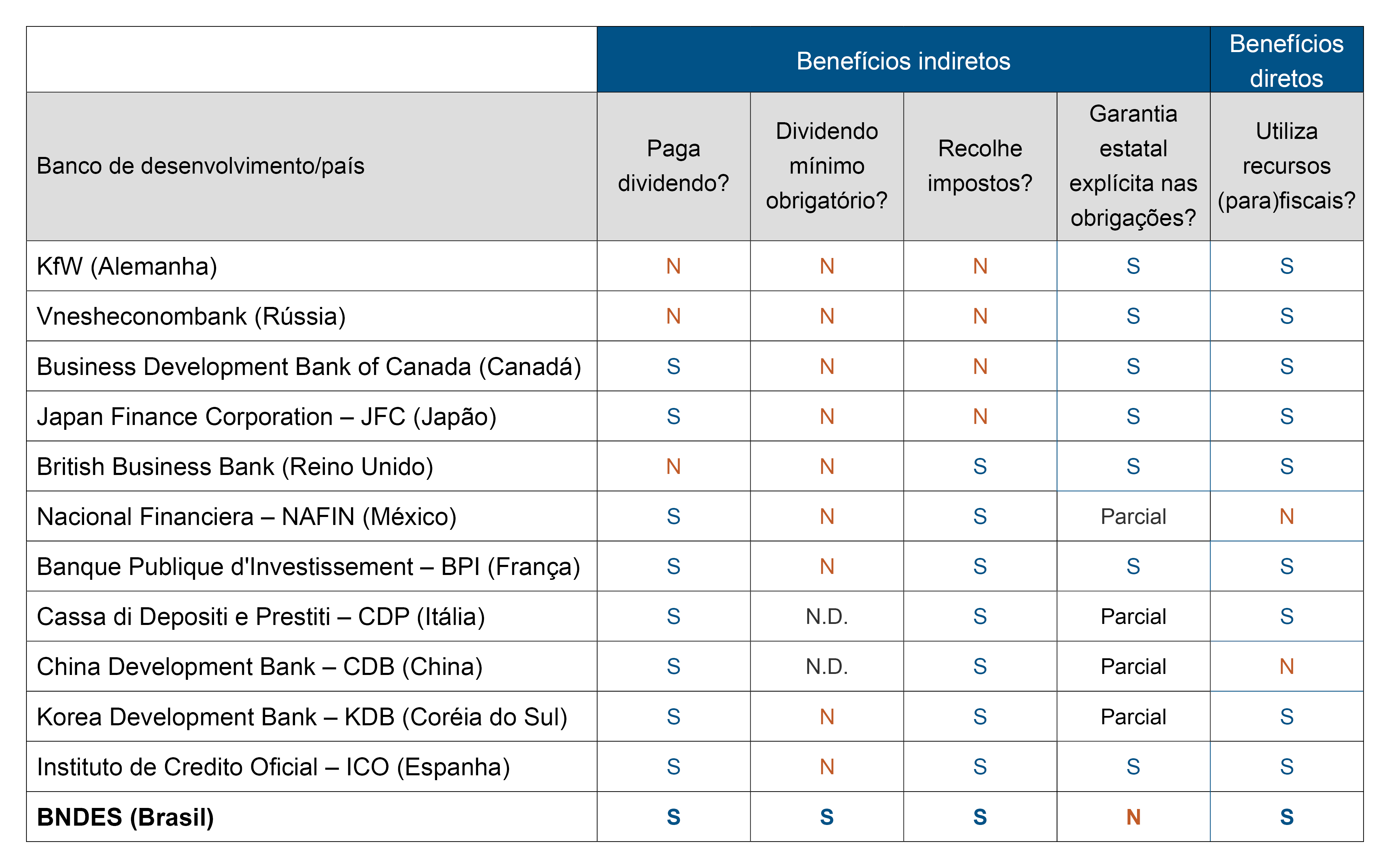 No que se refere aos benefícios diretos, nove instituições têm acesso a recursos parafiscais, ainda que a maior parte dos bancos em países desenvolvidos consiga se financiar com emissão de títulos. No caso do China Development Bank (CDB) e da Nacional Financiera do México (NAFIN) não foram encontradas evidências do uso desse tipo de recurso, mas ambos receberam injeções de capital do governo, em 2014 e 2019 respectivamente.1
