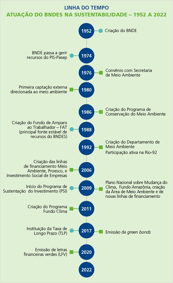 Em meados da década de 1970, o BNDES estabeleceu convênio com a Secretaria Federal de Meio Ambiente, iniciando uma trajetória de inclusão da pauta ambiental em suas atividades-fim.