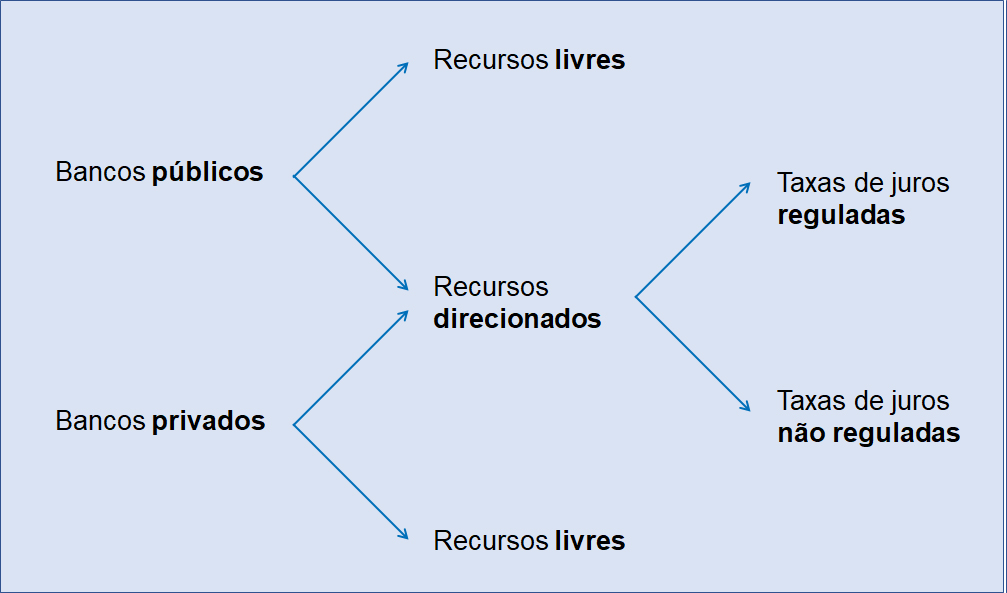 O mercado de crédito bancário no Brasil pode ser analisado de diversas formas. Pelo lado da demanda por recursos, é possível dividi-lo entre pessoas físicas (PF) e pessoas jurídicas (PJ), ou ainda pelos segmentos demandantes – rural, habitacional, indústria, comércio/serviços e pessoas físicas. Também se pode fazer a análise pelo lado da oferta, tanto pela origem de capital das instituições financeiras – bancos púbicos ou bancos privados – como pela origem dos recursos – livres ou direcionados.
