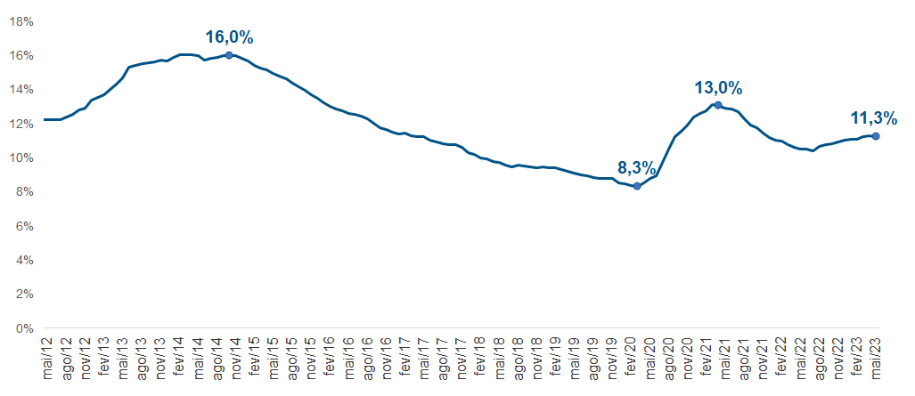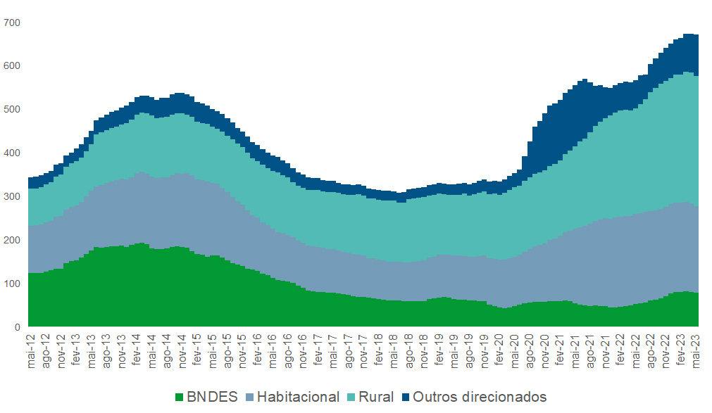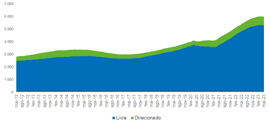 Nota-se claramente que o volume de recursos direcionados é, historicamente, bem reduzido em relação ao de recursos livres. No acumulado dos 12 meses, encerrados em maio de 2023, as concessões totais de crédito à economia atingiram cerca de R$ 6,0 trilhões. Desse valor, algo como R$ 5,3 trilhões foram concedidos com recursos livres, e apenas R$ 0,67 trilhão mediante operações com recursos direcionados.