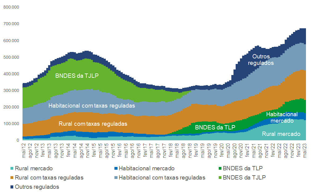 Dentre os fluxos de crédito direcionado com taxas reguladas, os segmentos rural e habitacional perfazem, respectivamente, R$ 177 bilhões e R$ 157 bilhões, representando 26% e 23% da totalidade dos recursos direcionados no acumulado em 12 meses até maio de 2023. Outros recursos direcionados somam R$ 95 bilhões, respondendo por 14% da totalidade, completando os 64% dos fluxos com taxas reguladas.