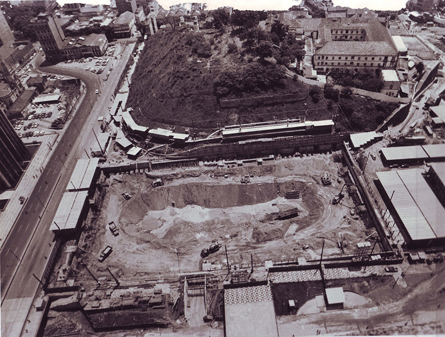 Durante a obra, houve um deslizamento de terra do morro para dentro do terreno. Apesar dos atrasos que isso gerou, também trouxe benefícios. O Banco acabou comprando do Convento de Santo Antônio parte do terreno que havia deslizado e, com isso, o projeto ganhou uma área de jardim, projetada por Burle Marx.